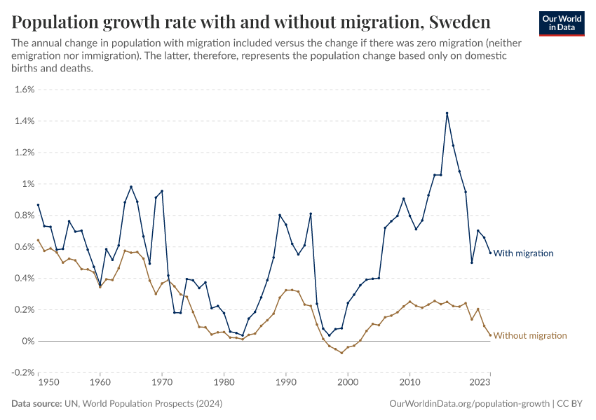 In 2023, Sweden’s population growth rate was 0.56%, and the chart shows how this has changed over time.
