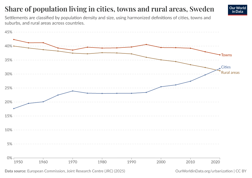 In the chart, you can see how the share of people in Sweden who live in rural areas, towns, and cities has changed over time.
