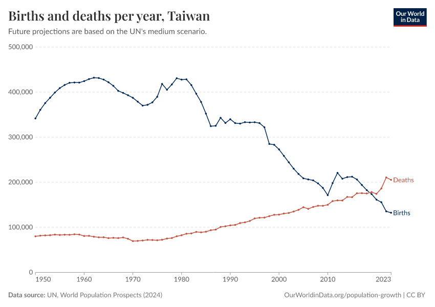 The chart below shows how births and deaths in Taiwan have changed over time.