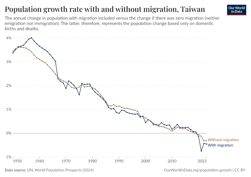 In 2023, Taiwan’s population growth rate was -0.45%, and the chart shows how this has changed over time.