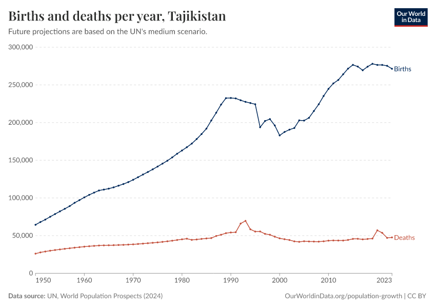 The chart below shows how births and deaths in Tajikistan have changed over time.