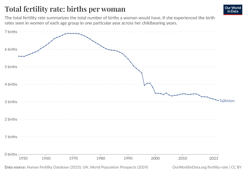 In 2023, Tajikistan’s total fertility rate was 3.07 births per woman.