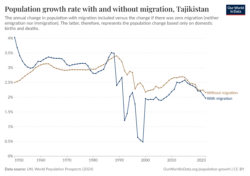 In the chart, you can see Tajikistan’s population change with migration, next to a scenario where migration was zero. In this case, population changes would only be determined by births and deaths.