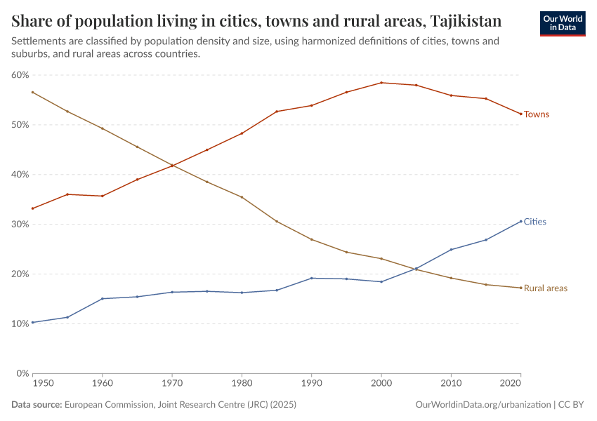 In the chart, you can see how the share of people in Tajikistan who live in rural areas, towns, and cities has changed over time.