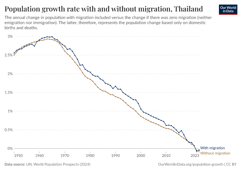 In 2023, Thailand’s population growth rate was -0.04%, and the chart shows how this has changed over time.