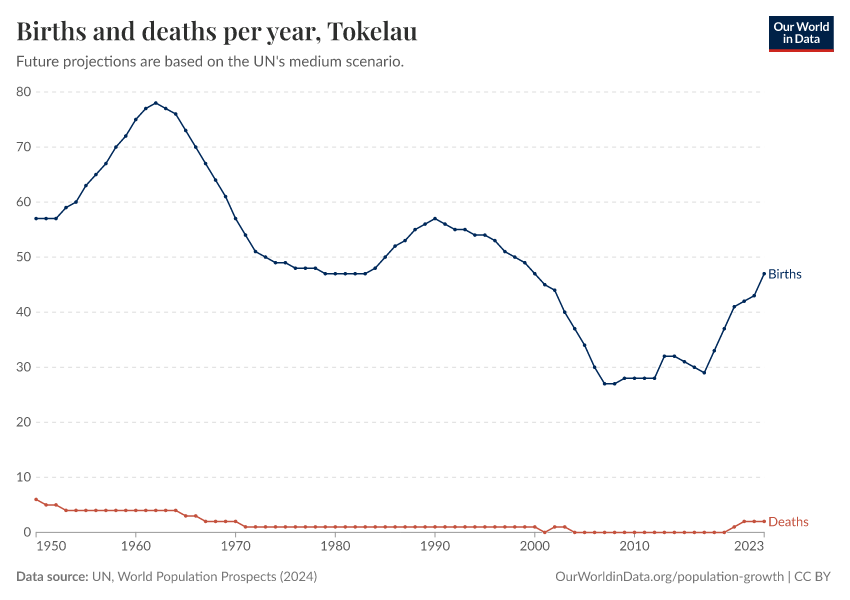 The chart below shows how births and deaths in Tokelau have changed over time.