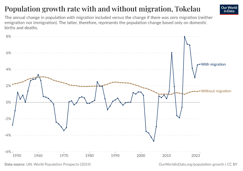 In the chart, you can see Tokelau’s population change with migration, next to a scenario where migration was zero. In this case, population changes would only be determined by births and deaths.