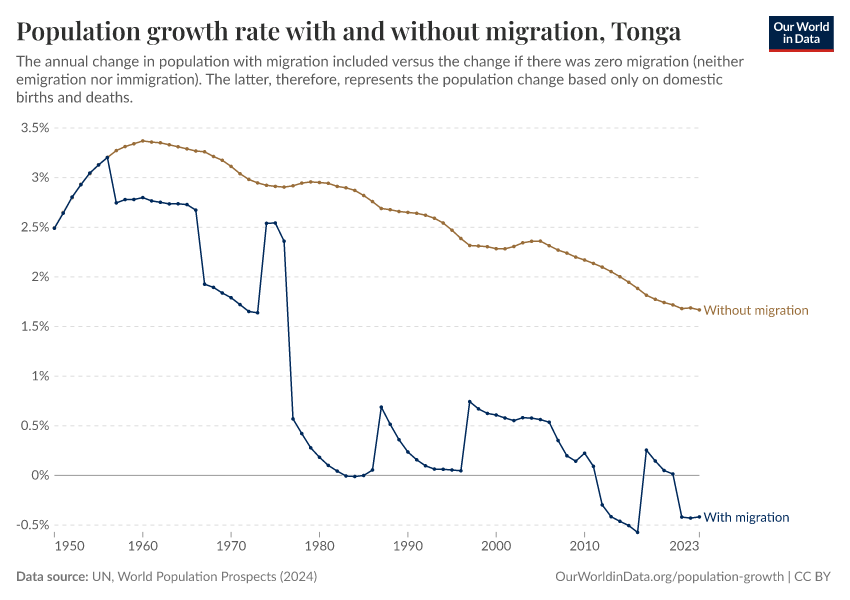 In the chart, you can see Tonga’s population change with migration, next to a scenario where migration was zero. In this case, population changes would only be determined by births and deaths.