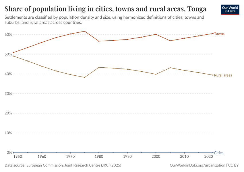 In the chart, you can see how the share of people in Tonga who live in rural areas, towns, and cities has changed over time.