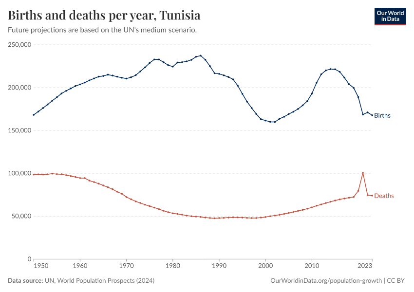 The chart below shows how births and deaths in Tunisia have changed over time.