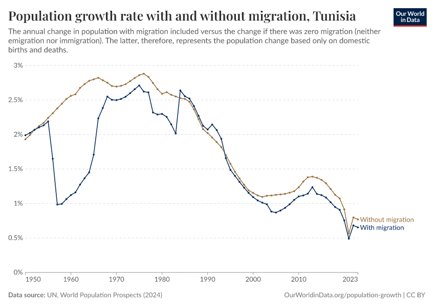 In the chart, you can see Tunisia’s population change with migration, next to a scenario where migration was zero. In this case, population changes would only be determined by births and deaths.