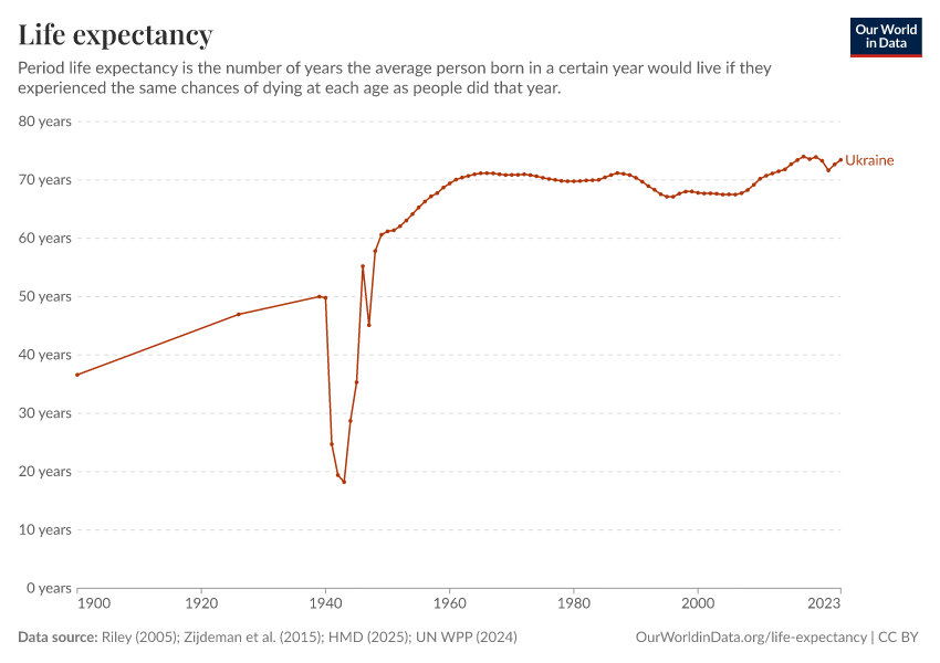 In 2023, Ukraine’s life expectancy at birth was 73.4 years.
