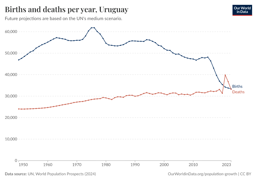 The chart below shows how births and deaths in Uruguay have changed over time.