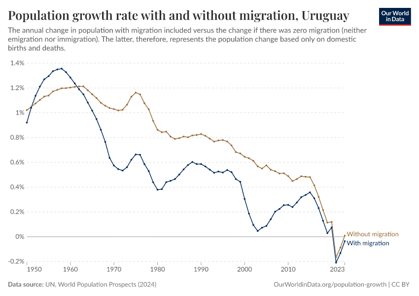 In the chart, you can see Uruguay’s population change with migration, next to a scenario where migration was zero. In this case, population changes would only be determined by births and deaths.