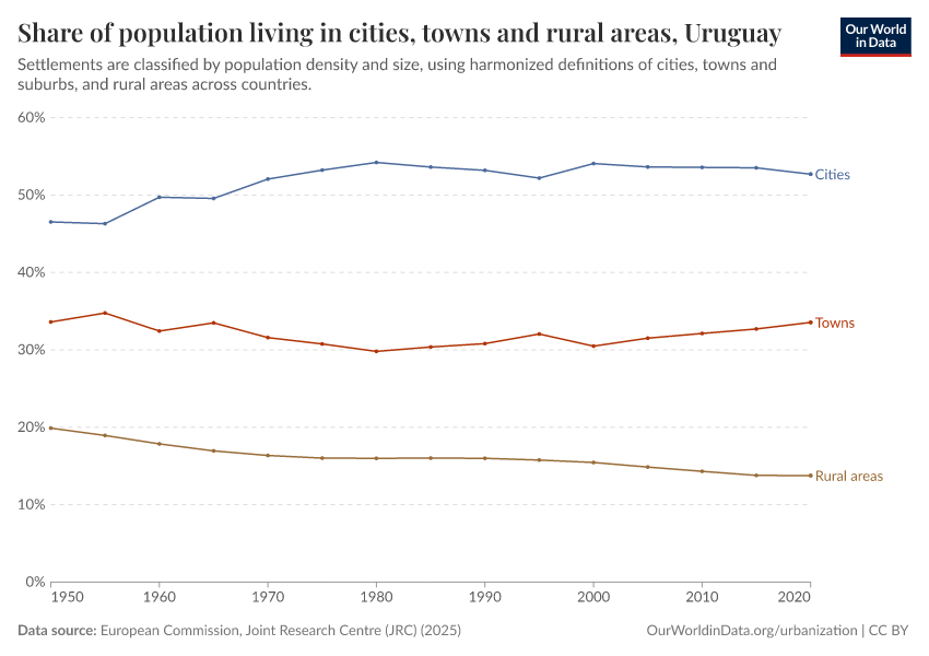 In the chart, you can see how the share of people in Uruguay who live in rural areas, towns, and cities has changed over time.