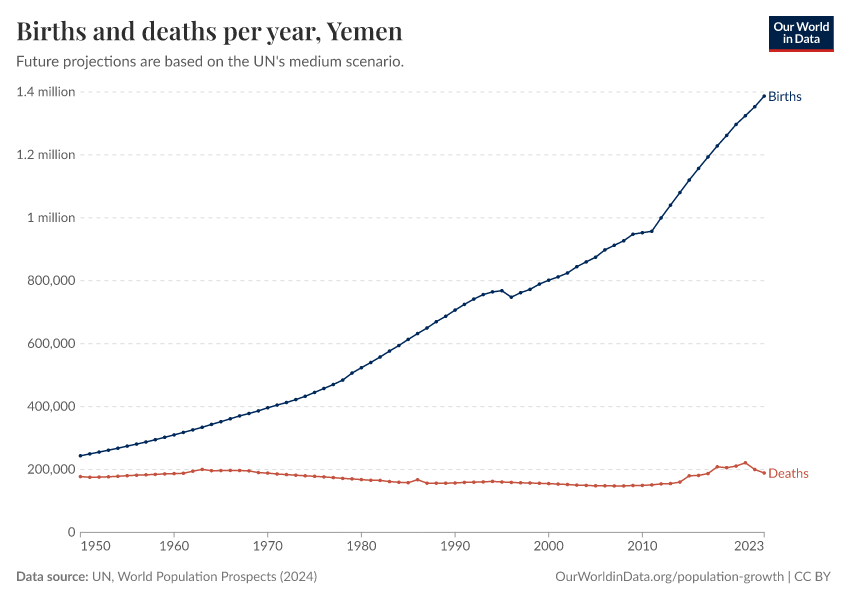 The chart below shows how births and deaths in Yemen have changed over time.