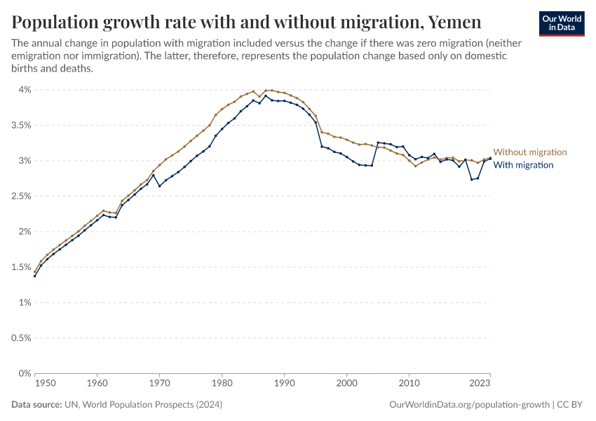 In the chart, you can see Yemen’s population change with migration, next to a scenario where migration was zero. In this case, population changes would only be determined by births and deaths.