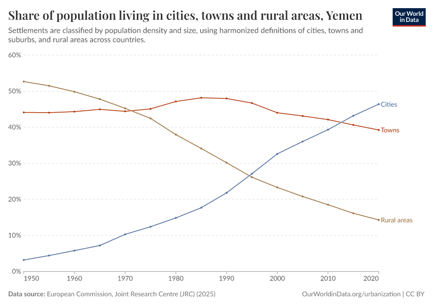In the chart, you can see how the share of people in Yemen who live in rural areas, towns, and cities has changed over time.