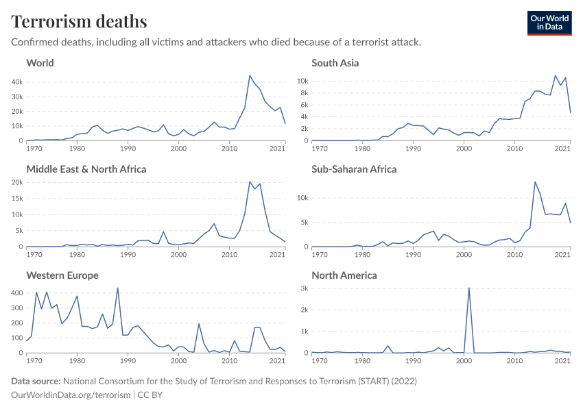 Bastian Herre, Veronika Samborska, Hannah Ritchie, and Max Roser (2023) - “Terrorism” Published online at OurWorldinData.org. Retrieved from: 'https://ourworldindata.org/terrorism' [Online Resource]BibTeX citation