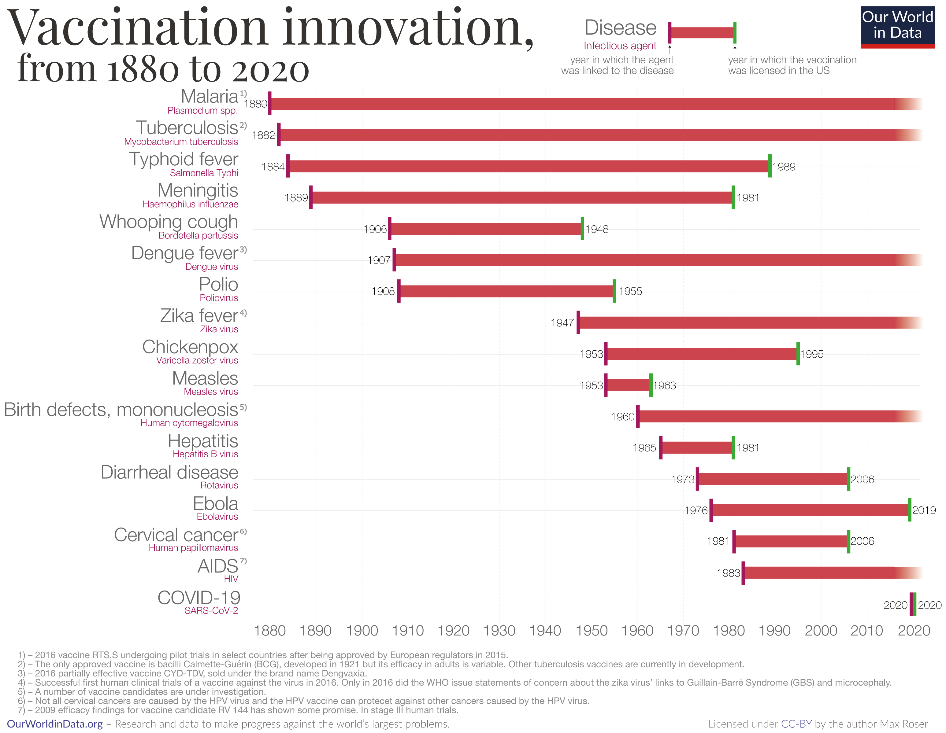 The chart here shows a timeline of innovation in the development of vaccines as of 2020. Each bar begins in the year when the pathogenic agent was first linked to the disease, and the bar ends in the year when a vaccine against that pathogen was licensed in the United States.