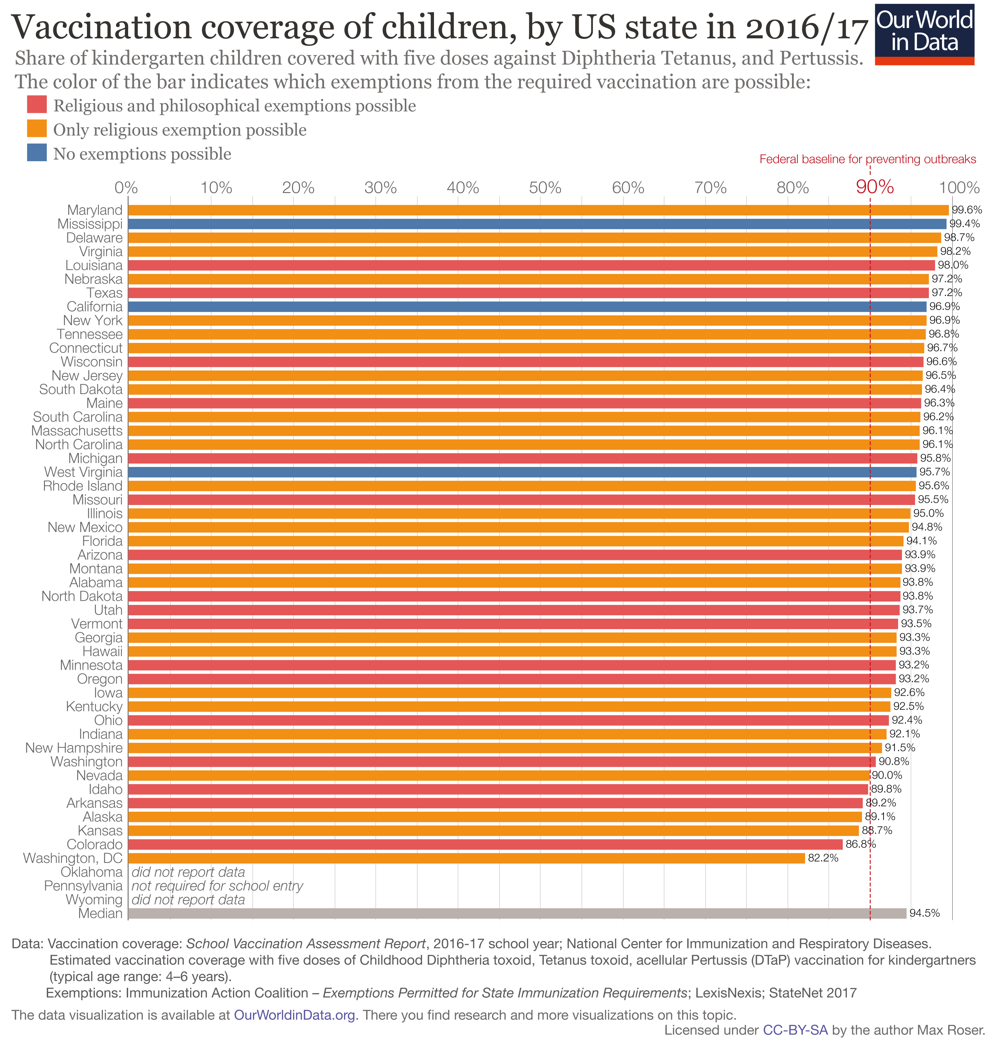 The data source for vaccination coverage: School Vaccination Assessment Report, 2016-17 school year.