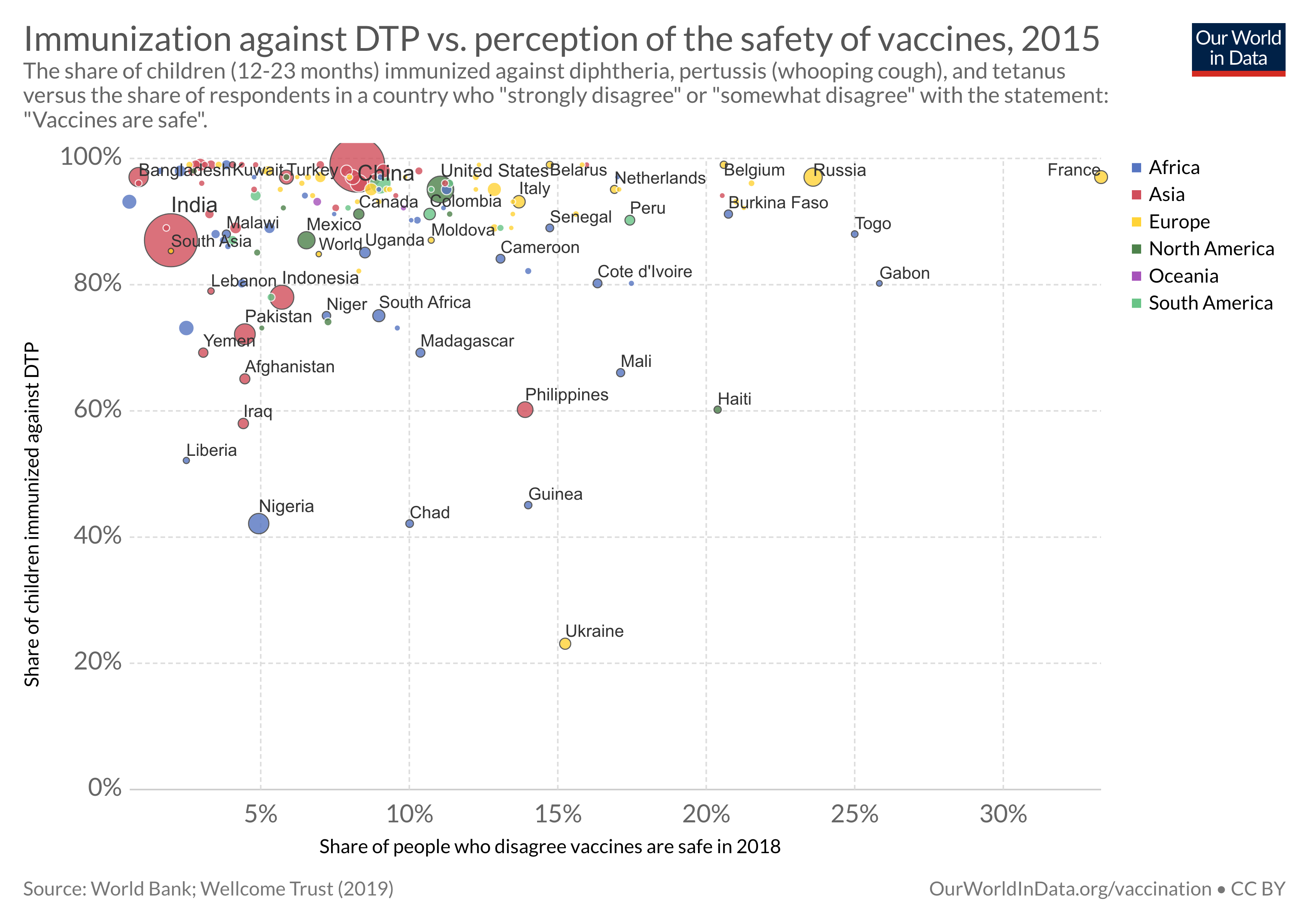 This chart shows that poorer countries tend to be those with lower vaccination coverage for DTP. Similarly, countries in which a large share of the population is living in extreme poverty often — but not always — have lower immunization rates, as this related chart shows.