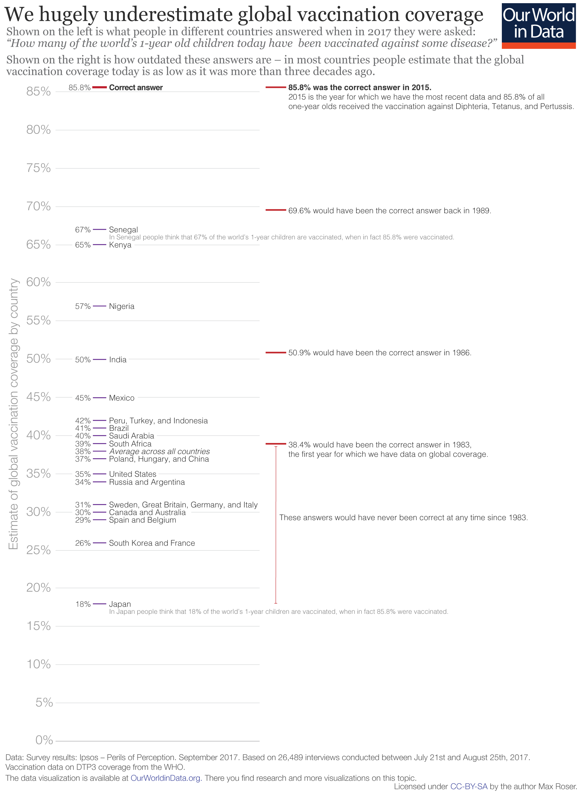 In the previous section, we saw how over a hundred million lives have been saved by childhood vaccinations over the last fifty years. That has been possible thanks to dramatically higher vaccination rates in recent decades.