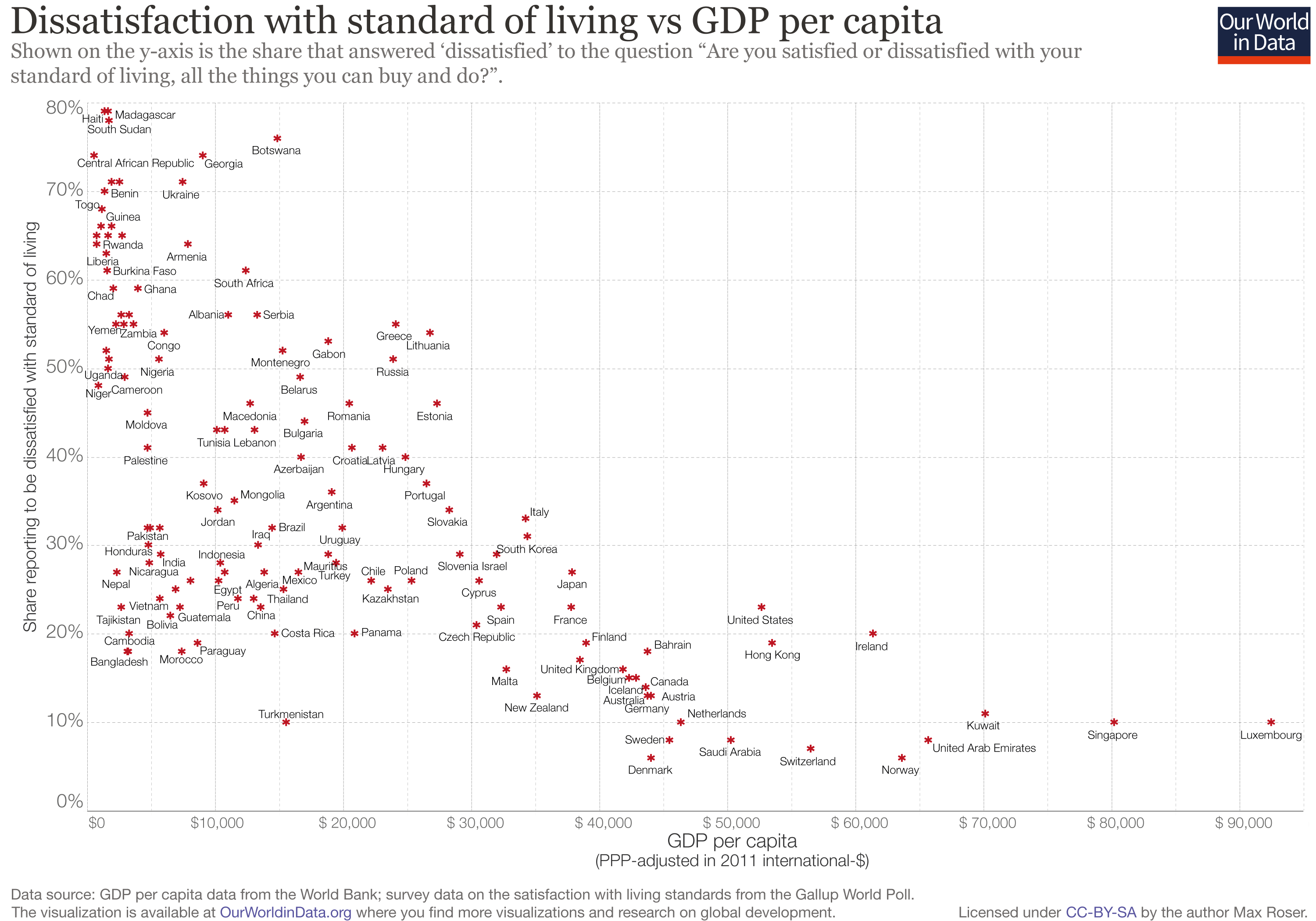 This suggests that economic prosperity is not a vain, unimportant goal but rather a means for a better life. The correlation between rising incomes and higher self-reported life satisfaction is shown in our topic page on happiness.