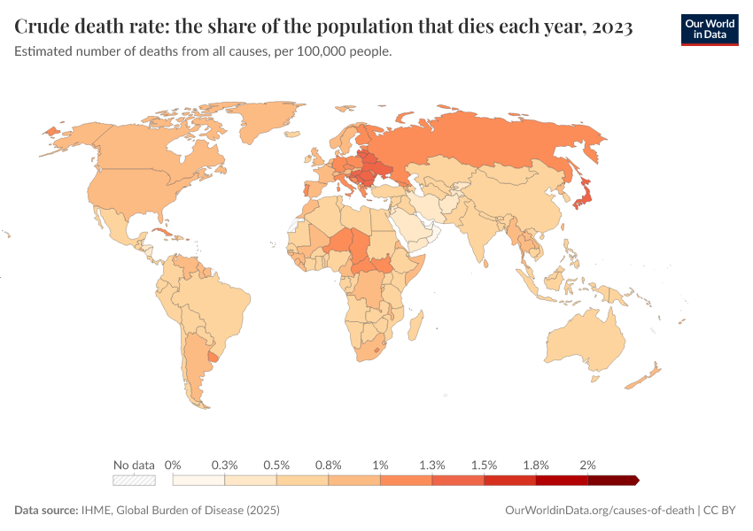 IHME, Global Burden of Disease (2025) – with major processing by Our World in Data. “Crude death rate: the share of the population that dies each year – IHME” [dataset]. IHME, Global Burden of Disease, “Global Burden of Disease - Deaths” [original data]. Retrieved April 3, 2026 from https://archive.ourworldindata.org/20260323-161325/grapher/crude-death-rate-the-share-of-the-population-that-dies-each-year-gbd.html (archived on March 23, 2026).